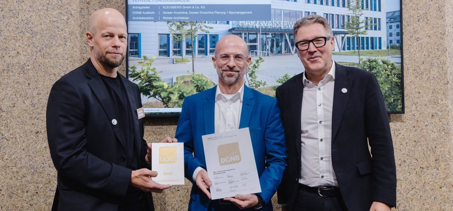 Die neue Firmenzentrale der Harzwasserwerke GmbH in Hildesheim wurde von der Deutschen Gesellschaft für Nachhaltiges Bauen (DGNB) mit dem Nachhaltigkeitszertifikat in Gold ausgezeichnet. Auf der EXPO REAL in München fand nun die feierliche Übergabe des Zertifikats statt. Johannes Kreißig, Geschäftsführender Vorstand DGNB, und Markus Kelzenberg, Geschäftsführer und Leiter der DGNB Zertifikatsstelle, überreichten die Auszeichnung an unseren Geschäftsführer des Modularen Bauens Oliver Hartmann. Damit wird das von KLEUSBERG realisierte Gebäude als Beispiel für zukunftsorientiertes, ressourcenschonendes und nutzerfreundliches Bauen gewürdigt. Grundlage der Bewertung ist ein ganzheitliches Konzept, das ökologische, ökonomische, soziokulturelle, funktionale, technische sowie prozessuale Qualitäten berücksichtigt. Ziel der DGNB-Zertifizierung ist es, Gebäude über ihren gesamten Lebenszyklus hinweg nachhaltig zu planen, zu errichten und zu betreiben.