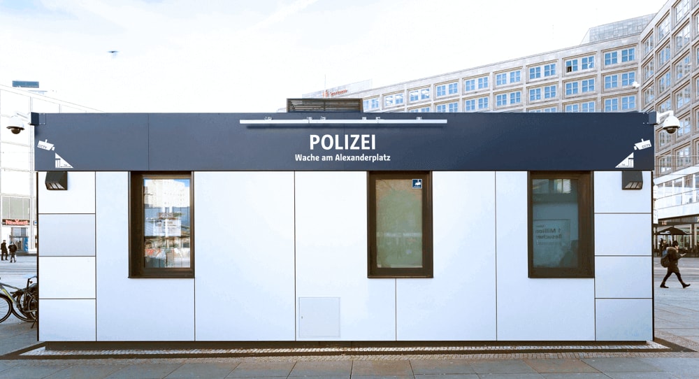 Die neue Polizeiwache, welche KLEUSBERG in modularer Bauweise errichtet hat, stellt einen wichtigen Baustein im Gesamtkonzept zur Kriminalitätsbekämpfung am Alexanderplatz dar. Maximale Transparenz, schnelle Einsatzfähigkeit und Bürgernähe standen hier als Kernaspekte im Vordergrund. „Wir wollen den Bürgerinnen und Bürgern zeigen: Die Polizei ist da, wo sie gebraucht wird. Sichtbar, ansprechbar und hilfsbereit.“, so Innensenator Andreas Geisel in einem Bericht des Berliner Stadtportals www.berlin.de. Das Dienstgebäude wird als Visitenkarte der Polizei Berlin angesehen. Daher sollte die Wache als professionelles und sicheres Umfeld für die Menschen wahrgenommen werden. Im Inneren ist die Polizeiwache zweckdienlich und gleichzeitig freundlich und stilvoll eingerichtet. Bodentiefe Glaselemente schaffen Transparenz und spiegeln die Offenheit der Polizei gegenüber den Bürgerinnen und Bürgern wieder.
