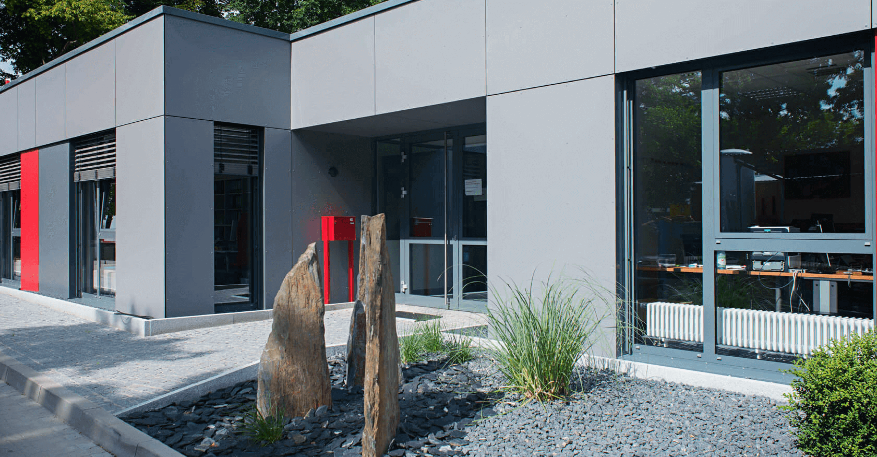 Da keine statischen Zwangspunkte gegeben sind, die die Gestaltungsfreiheit einschränken, konnten auch innerhalb des Gebäudes die Raumaufteilungen entsprechend dem Bedarf angepasst werden. Durch den nachträglichen Treppeneinbau wirkt das Obergeschoss wie eine Art Galerie. Diese verleiht dem Gebäudeinneren eine offene Atmosphäre. Für die Positionierung des Treppenaufgangs wurde beispielsweise eine Lichtkuppel im Entrée des ursprünglichen Gebäudes entfernt. Damit der Flurbereich trotzdem mit ausreichend natürlichem Lichteinfall versorgt wird, kam im Obergeschoss eine neue, 4x4 m große Pyramidenlichtkuppel zum Einsatz, die nicht nur für die gewünschte Helligkeit sorgt, sondern auch ein architektonisches Highlight darstellt. Das sonnenschutzisolierte Glas verringert eine übermäßige Aufheizung der Räume an heißen Sommertagen. Im zentralen Kern des Gebäudes befindet sich ein Atrium, welches mit Sitzgelegenheiten als Ruhezone dient und die Gebäudestruktur auflockert. Von dort aus sind die umliegenden Räume zugänglich. Auch nach der Aufstockung wurde diese Zone beibehalten und der offene Luftraum nach oben weitergeführt. Weitere Aufenthaltsmöglichkeiten im Freien bieten überdachte Balkone an zwei Gebäudeseiten des Obergeschosses sowie eine separate Holzterrasse. Die nachträgliche Überarbeitung des Fassadenkonzeptes erforderte den Austausch einzelner HPL-Platten im Erdgeschoss, um ein schlüssiges Gesamtbild zu schaffen. Die zum Einsatz kommenden Farben richten sich nach dem Corporate Identity des Bauherrn. Möbel und andere Einrichtungsdetails wurden parallel den Ausführungen im Erdgeschoss gewählt. So kamen beispielsweise Designerleuchten zum Einsatz, die den einzelnen Räumen ein besonderes Flair geben.