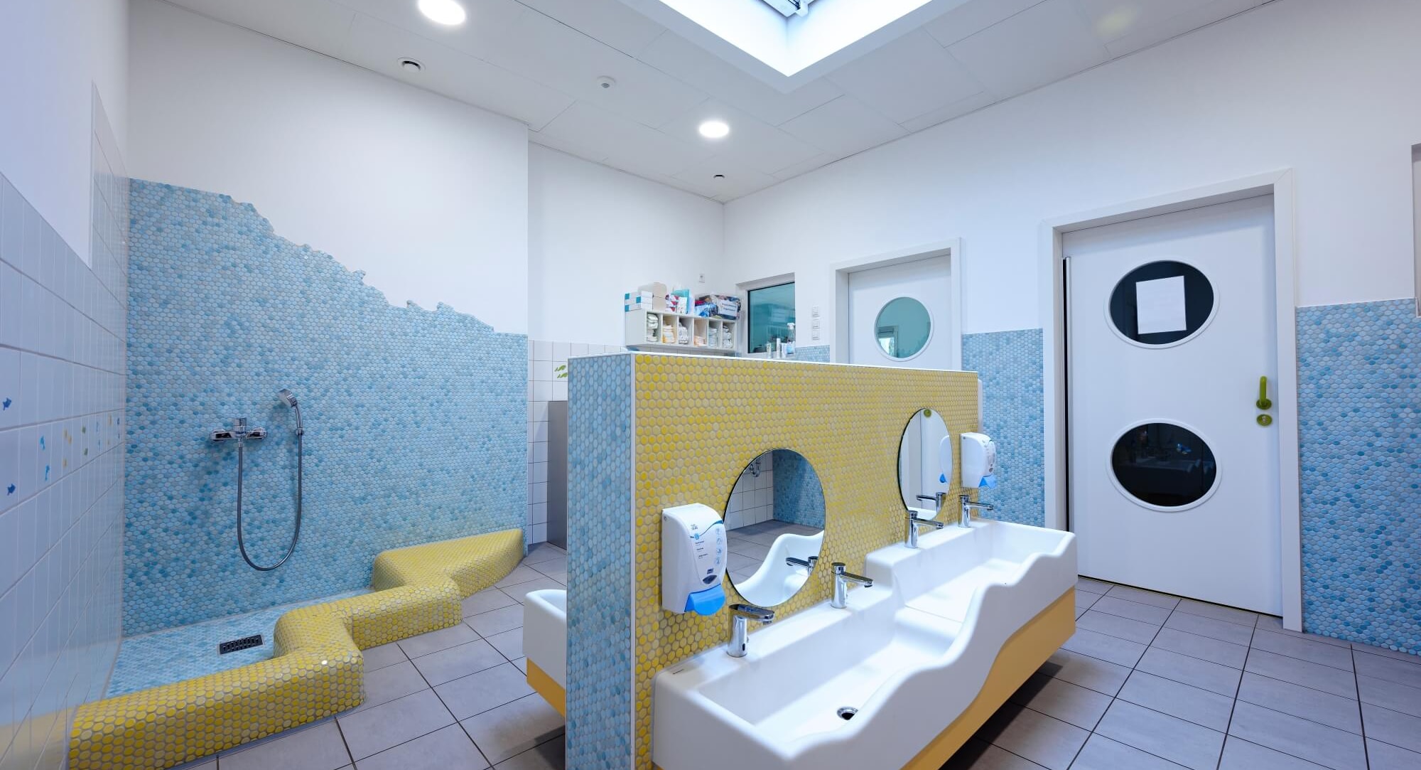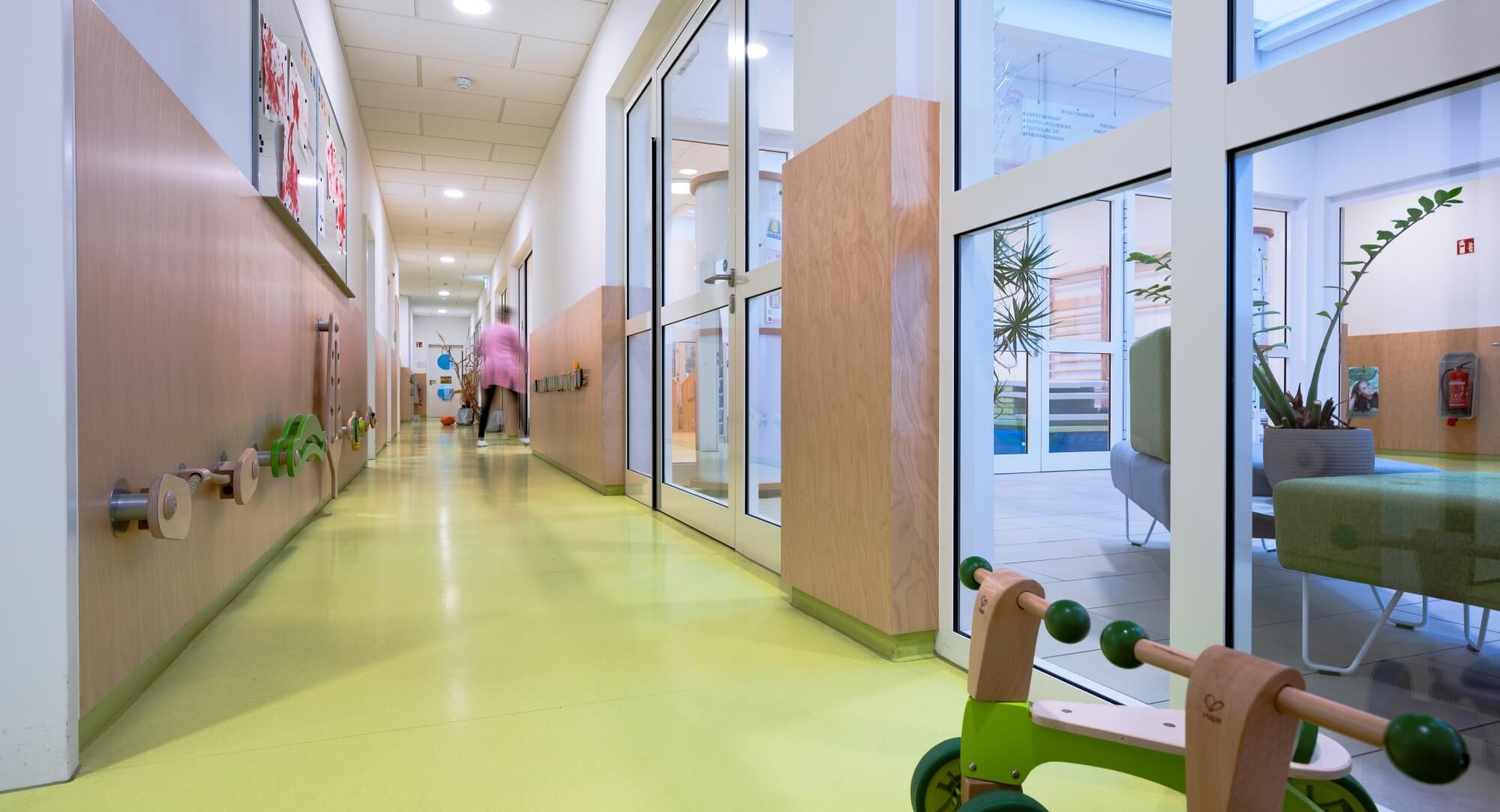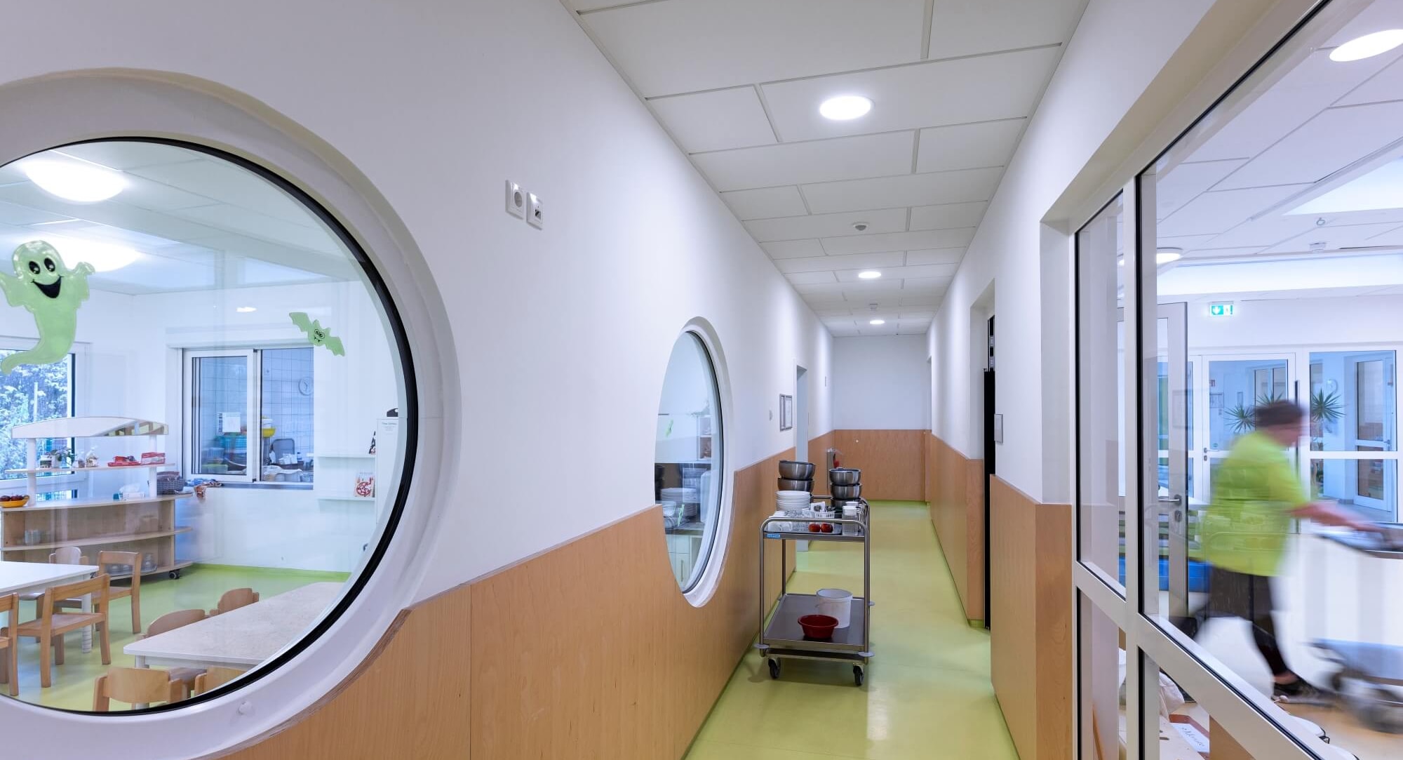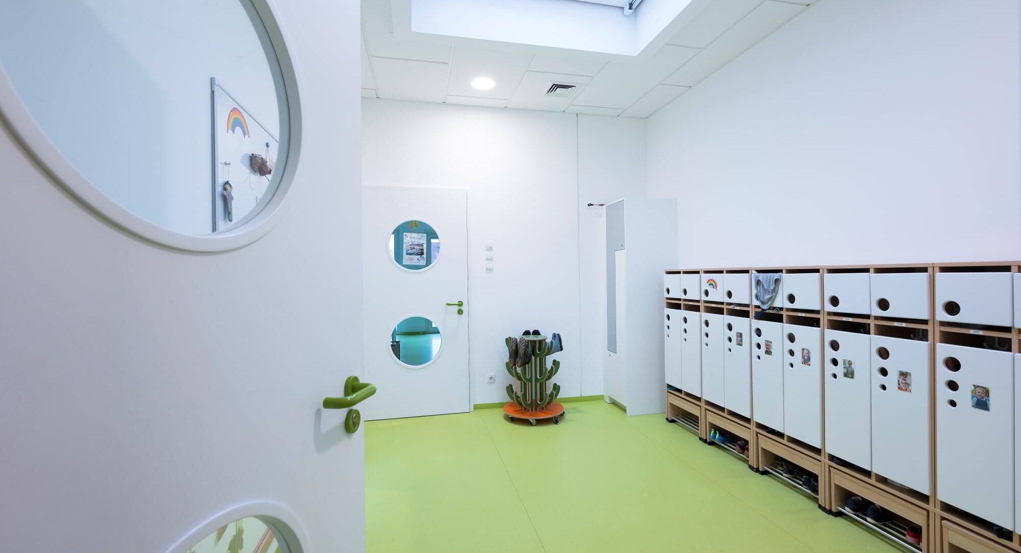 Auf die Selbstständigkeit der Kinder wurde bei diesem Projekt besonderer Wert gelegt. Die Haupteingänge und anderen Gebäudezugänge sind insbesondere für die Kinder ablesbar ausgebildet und leicht auffindbar angeordnet. Der überdachte, groß verglaste Eingangsbereich wurde für die Ankommens- und Orientierungsfunktion angemessen dimensioniert. Verspielte Sitzmöglichkeiten vor dem Eingangsbereich laden zum Warten und Verweilen ein. Eine große Lichtkuppel im Inneren erzeugt einen hellen, freundlichen Raum und den Kindern ermöglicht von drinnen die Veränderungen des Himmels zu betrachten. Bodentiefe Fenster geben den Kindern die Freiheit eigenständig ihre Umwelt zu entdecken. Allgemein wurde auf das Wohl der Kinder und die Barrierefreiheit ein großer Fokus gesetzt, der durch eine ebenerdige Bauweise verwirklicht wird, die intern über Flure und den Garderobenbereich erschlossen wird.