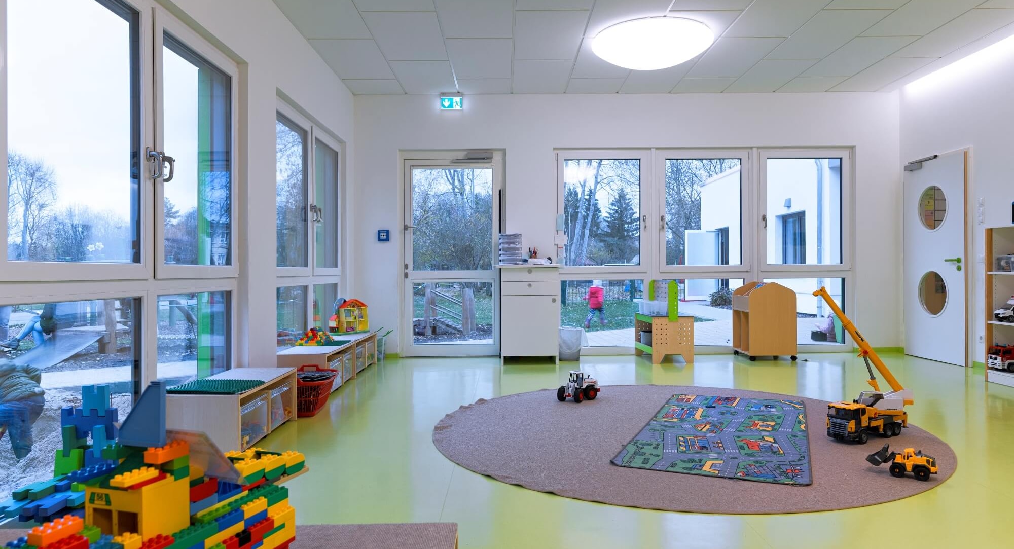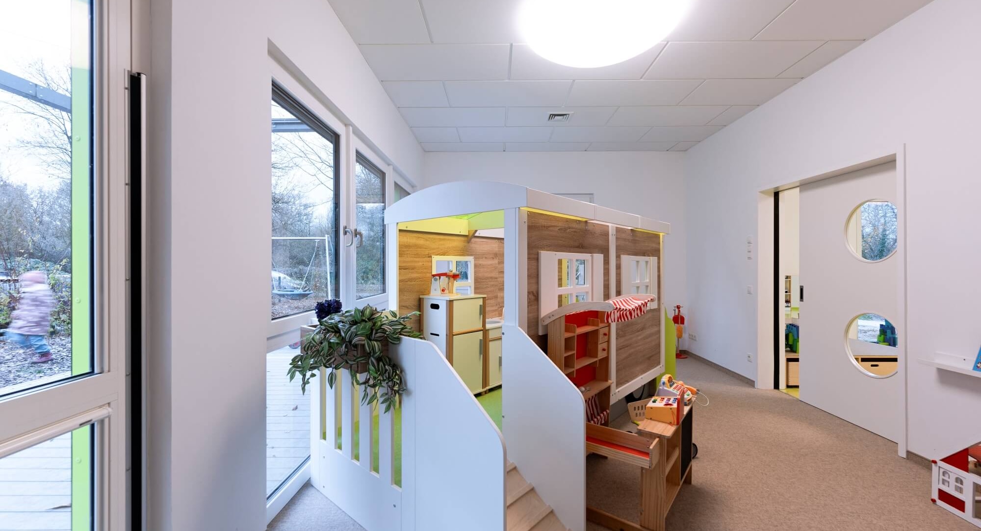 Das Raumprogramm der Kita setzt sich aus vier „pädagogisch“ genutzten Raummodulen, einer Küche mit anschließendem Essensraum für die Kinder sowie einem Personal- und Technikraum zusammen. Eine große, außenliegende Spielfläche, schafft einen überdachten Zwischenraum, der auch bei Regen gut genutzt werden kann. Das Außengelände beinhaltet große Spielgeräte und Klettermöglichkeiten, auf denen die Kinder spielen und toben können. Ein separater Bereich für die U3 Gruppen sorgt für eine ruhige Umgebung für die Kleinsten, um die Welt in ihrer eigenen Geschwindigkeit spielerisch zu erkunden. Eine Terrasse vor den Kinder-Gruppenräumen mit einer Pergola, ist ein archetektonischer Blickfang, die auch für Events oder zum Spielen genutzt werden kann.