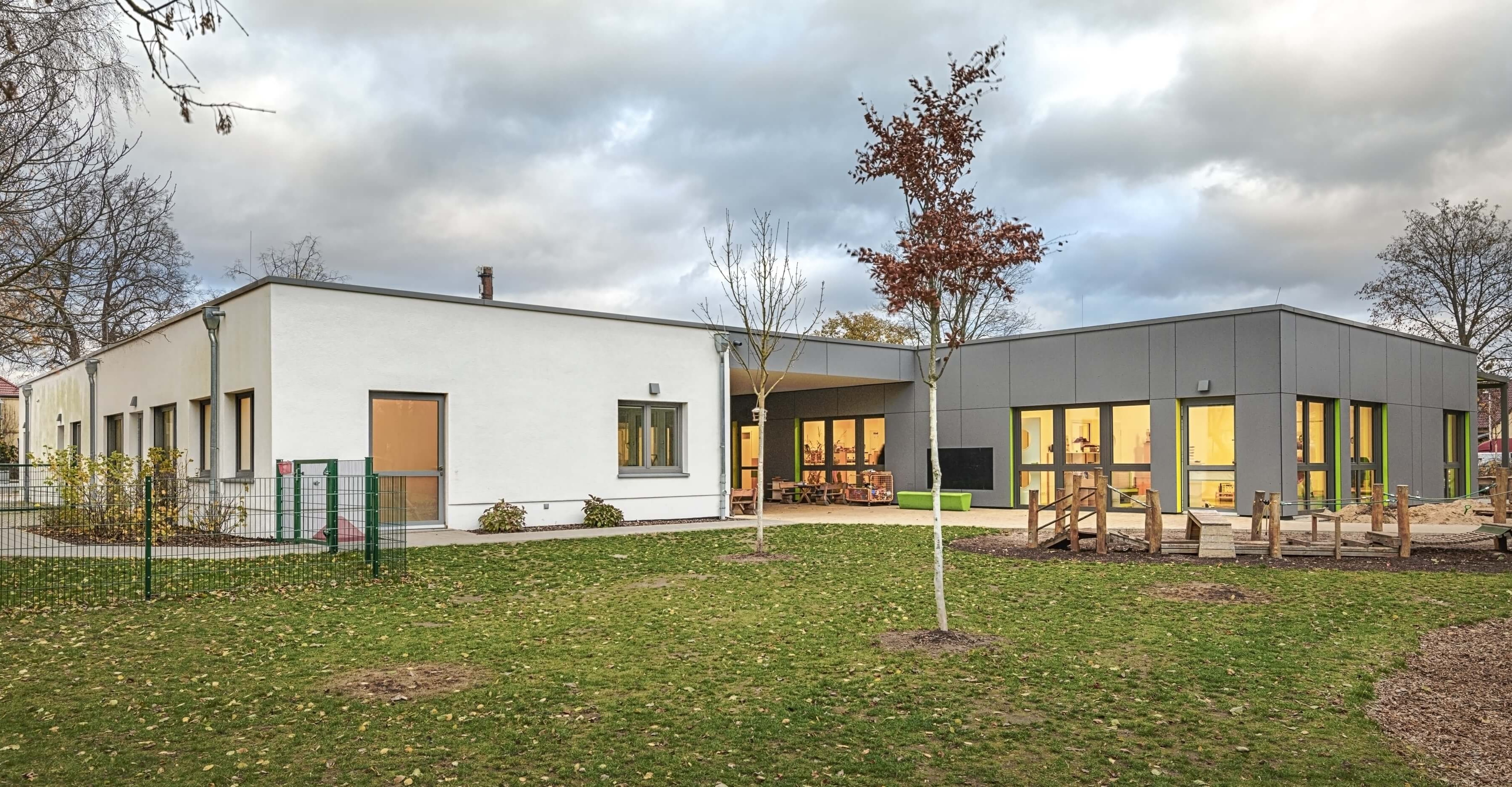Durch einen Mangel an Platz und den damit verbundenen Bedarf an neuen Räumlichkeiten bestand Bedarf für eine Erweiterung der KITA Sonnenschein in Zehdenick. Innerhalb von 9 Monaten ab Modulmontage konnte das 900 m² große Gebäude fertiggestellt werden. Der autarke Neubau wurde kompakt und flächensparend konzipiert, um das vorhandene Areal effektiv auszunutzen.