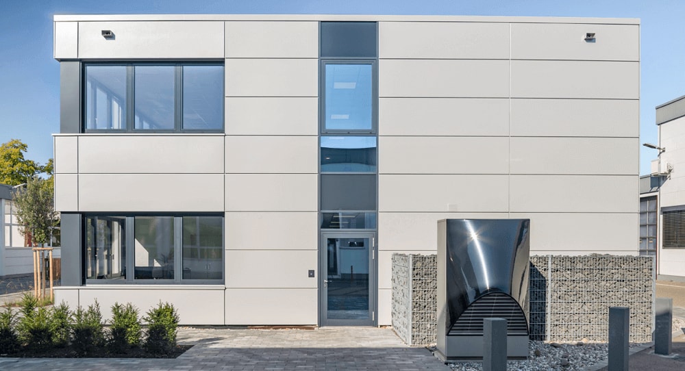 Ein gutes Arbeitsumfeld ist entscheidend für die Arbeitsmotivation der Mitarbeiter. Dieser Meinung war auch die Geschäftsführung des Hatzenbühler Unternehmens. Das von KLEUSBERG in Modulbauweise errichtete Bürogebäude bietet produktionsunterstützenden Abteilungen moderne und großzügige Räumlichkeiten. Als Referenzgebäude diente hier das KLEUSBERG Verwaltungsgebäude in Remseck. Daher finden sich einige Gestaltungsbestandteile, wie der vorgesetzte Eingangsbereich, das offen gehaltene Foyer sowie durch bodentiefe Glaselemente abgetrennte Besprechungsbereiche, wieder. Der Eingangswürfel erhielt ganz im Corporate Design der Eichenauer Heizelemente vier unterschiedliche Rottöne. Gleichzeitig wird dieser optisch vom übrigen Gebäudekörper, welcher mit einer weißaluminiumfarbenen Kassetten-Fassade versehen wurde, abgehoben. Zum Kühlen und Heizen der Räume wurden 4-Wege-Deckenkassetten installiert. Die mobile Trennwand in einem der Besprechungsbereiche ermöglicht es, dass der Raum bei Bedarf zweigeteilt werden kann. Die kurze Bauzeit war bei diesem Projekt beachtlich. Von der Modulmontage bis zur schlüsselfertigen Übergabe des Gebäudes vergingen gerade einmal 3 Monate.