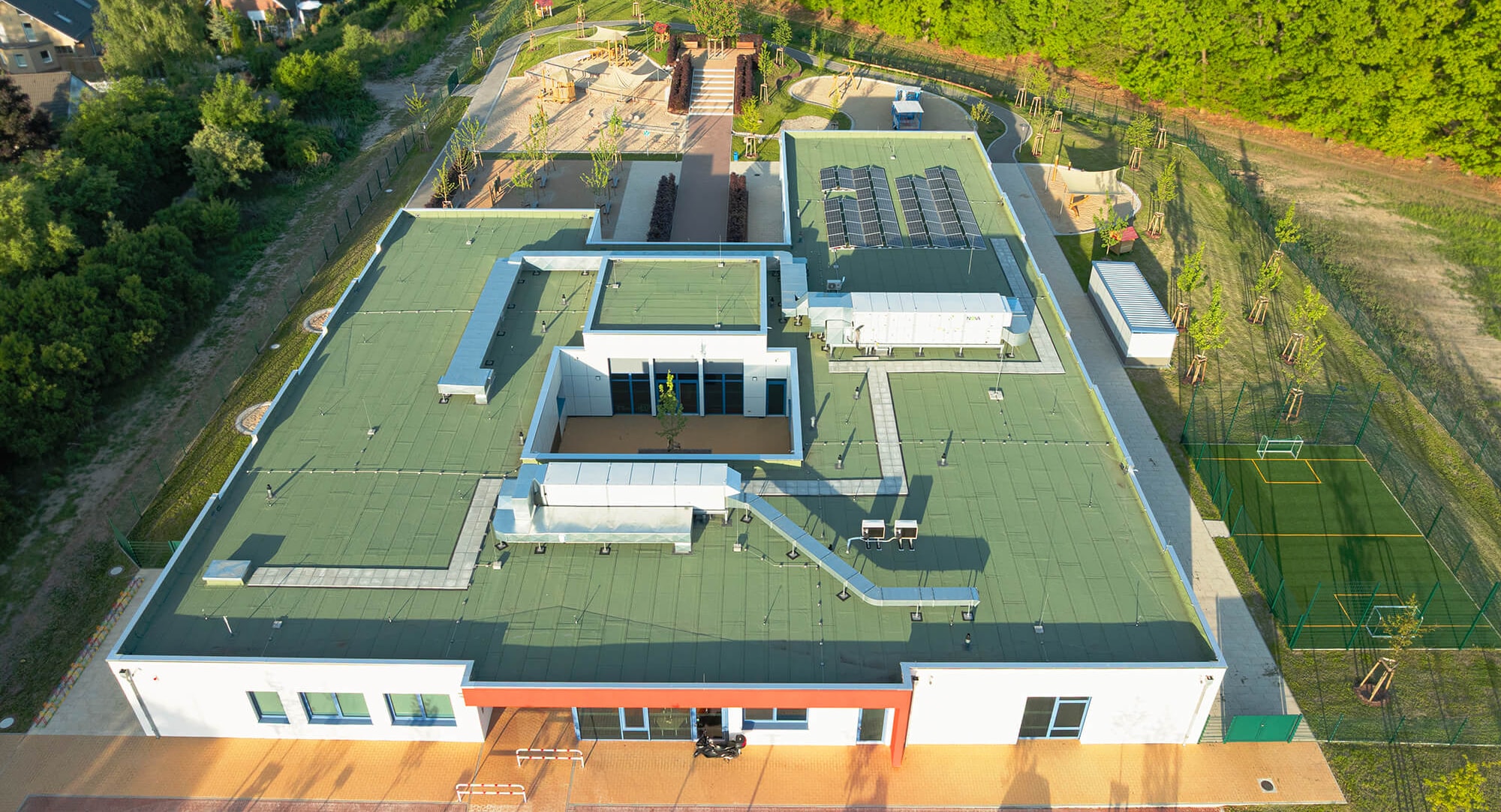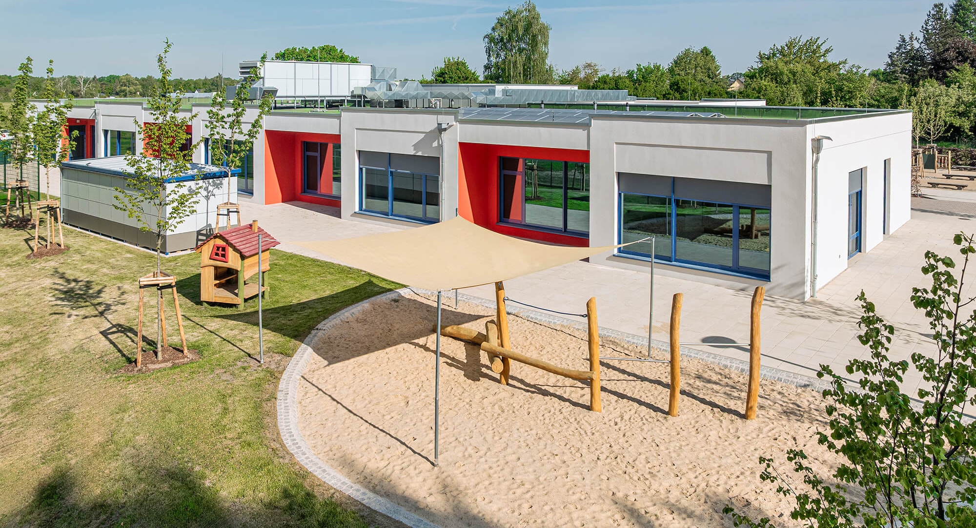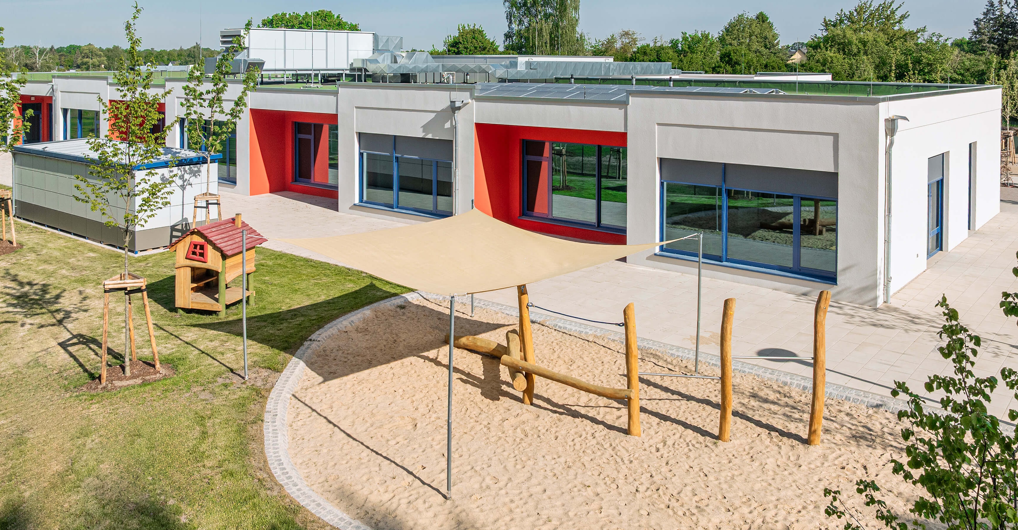 Der 1.630 m² große Neubau des Kindergartens in Blankenfelde-Mahlow wurde innerhalb von sieben Monaten von KLEUSBERG in Zusammenarbeit mit dem Architekturbüro LEITPLAN GmbH realisiert. Die 1-geschossige, barrierefreie Einrichtung entstand in Holz-Tafelbauweise und schafft durch die U-Form zwei klar gegliederte Bereiche mit einem geschützten Innenhof.