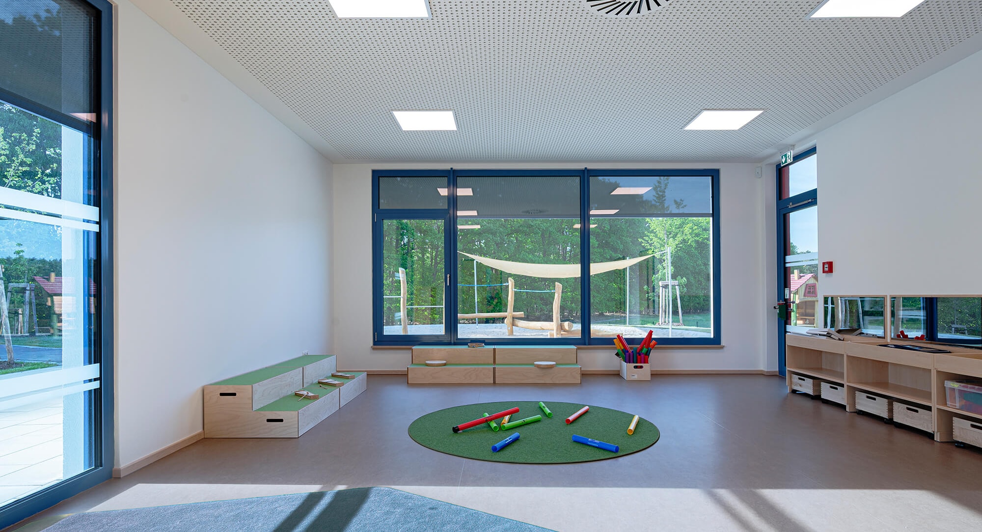 Ein verbindender Flur erschließt alle Raumbereiche und enthält integrierte Spielecken, die das Erleben und Erkunden über Raumgrenzen hinweg ermöglichen. Für die Kleinsten wurden zudem kindgerechte Sanitäranlagen und Wickeltische installiert.