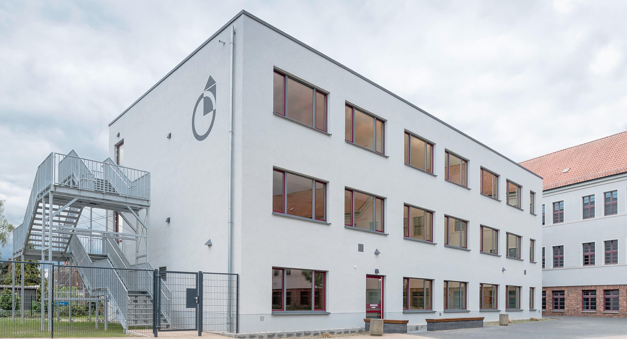 Seit 2003 mussten Schülerinnen und Schüler sowie Lehrkräfte des Walter-Gropius-Gymnasiums zwischen dem Hauptgebäude in der Peterholzstraße sowie einem Nebentrakt in der Tempelhofer Straße pendeln. Umso erleichterter zeigten sich die Nutzer, als bekannt wurde, dass KLEUSBERG einen Anbau in modularer Bauweise realisiert. Damit rückten die räumlichen Veränderungen und damit auch besseren Unterrichtsbedingungen in greifbare Nähe. Lediglich 5 Monate vergingen von der Modulmontage bis zur Übergabe. Durch die knapp 1.140 m² große Erweiterung konnten 8 großzügige Klassen mit moderner Medientechnik sowie weitere Nebenräume geschaffen werden. Bestandsgebäude und Neubau sind mit einem Verbindungsgang versehen, sodass im Falle eines Raumwechsels kurze Laufwege bestehen. Dieser Bereich wird in allen drei Geschossen durch die Pfosten-Riegel-Fassade von Tageslicht durchflutet. Im Erdgeschoss befindet sich außerdem der Haupteingang des Modulgebäudes mit kleinem Foyer.
