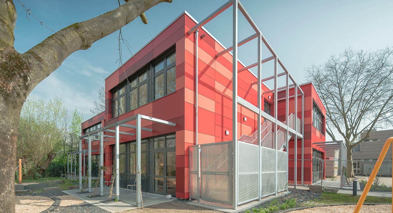 Zusätzlich zur extensiven Dachbegrünung wurden an der hinterlüfteten Vorhangfassade – aus farbigen Faserzementplatten – Pergolen aus feuerverzinktem Profilstahl angebracht. Stahlseile dienen als Rank-Hilfen für eine Fassadenbegrünung. Zwei Innenhöfe dienen als Rückzugsfläche für die Schüler:innen.