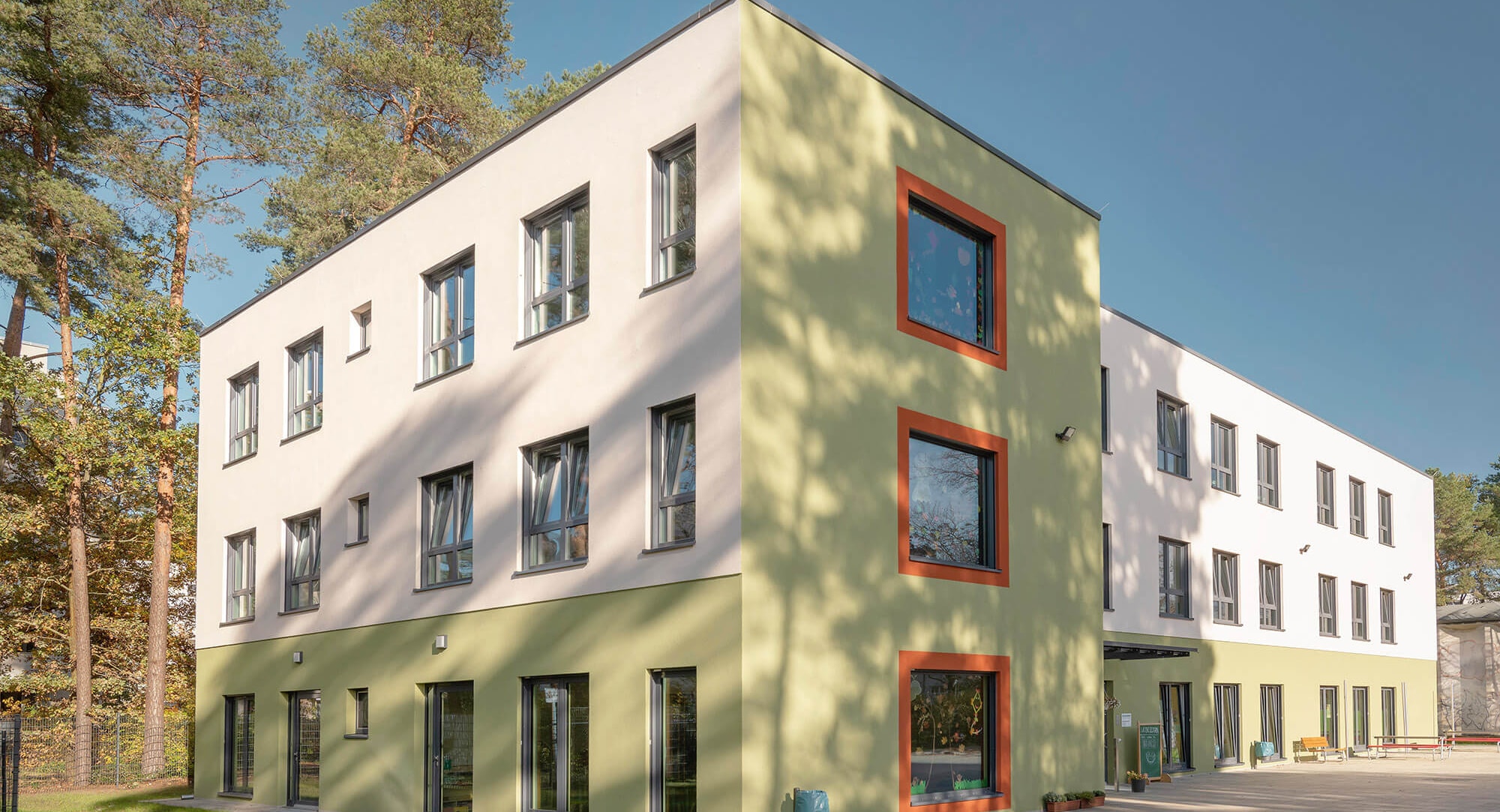 Auf drei Geschossen verfügt der Neubau über diverse Aufenthaltsbereiche, Räume für Spiel- und Freizeitaktivitäten sowie einen großzügigen Speisesaal. Des Weiteren können die Kids sich im Ruheraum zurückziehen sowie in einer Werkstatt ihrer Kreativität freien Lauf lassen. Um nicht nur für die Klassenstufen 1 und 2 geeignete Räume zu schaffen, sondern auch die höheren Altersstufen zu berücksichtigen, wurde im zweiten Obergeschoss ein Clubraum eingerichtet. Dank großer Fensterflächen, die weitestgehend bodentief ausgeführt wurden, fällt ausreichend Tageslicht in die Räume. Außerdem bietet sich so ein freier Blick nach draußen. Zum Teil tief angelegte Fensterbänke schaffen zusätzliche Sitzplätze oder können zum Spielen mit genutzt werden. Der rund 50 m² große Bewegungsraum im Erdgeschoss hält Spielgeräte zum Klettern und Toben bereit. Das Gebäude wurde barrierefrei geplant und verfügt über einen Aufzug.