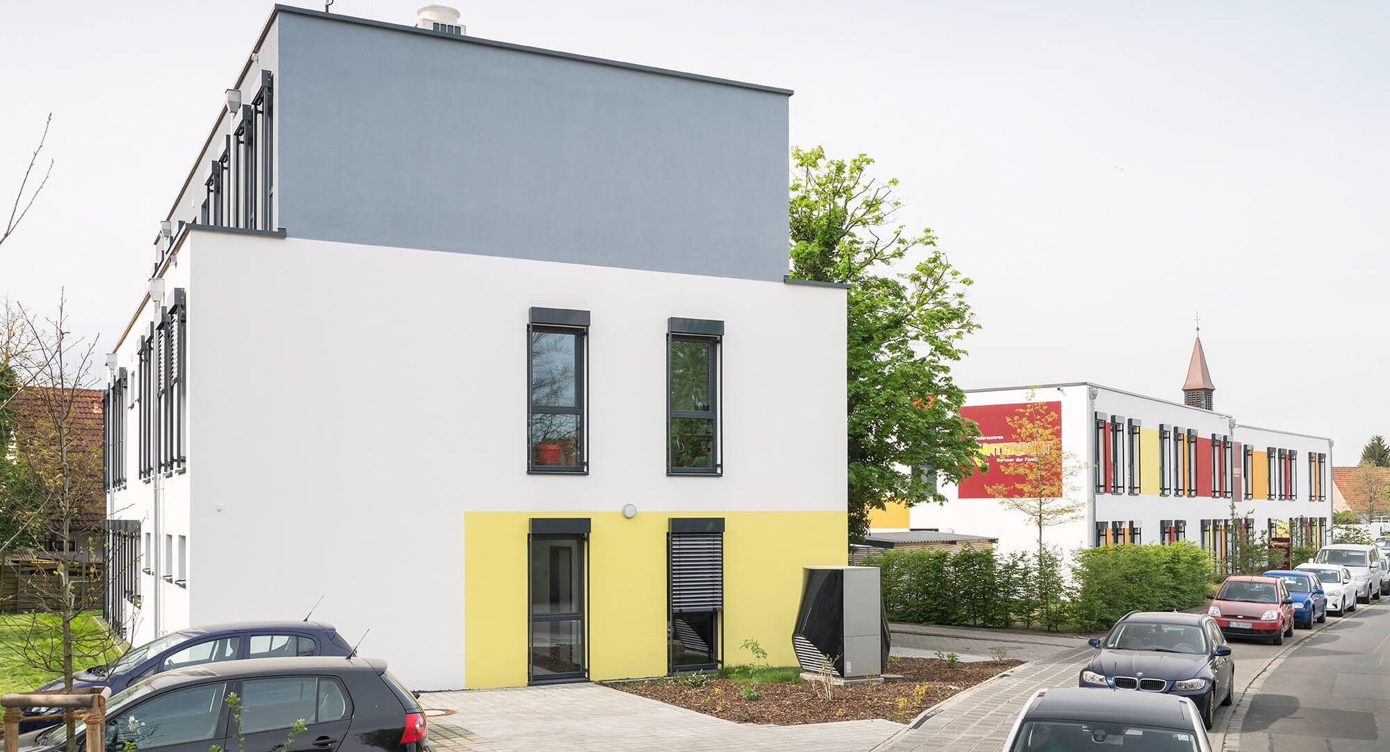 Nachdem KLEUSBERG bereits das Headquarter-Gebäude für Kinderzentren Kunterbunt in Nürnberg realisiert hatte, erforderte das Wachstum des Trägers einen weiteren Neubau, in dem zusätzliche Büro- und Besprechungsräume eingerichtet wurden. Das in direkter Nachbarschaft befindliche Modulgebäude besticht durch ein geradliniges Erscheinungsbild, welches von gleichmäßig angeordneten, bodentiefen Fenstern geprägt ist. Das Staffelgeschoss hebt sich mit grauem Anstrich bewusst vom übrigen Gebäudekörper ab. Die räumliche und technische Ausstattung gleicht der des Headquarter-Gebäudes. Beheizt wird der Neubau über eine Luft-Wasser-Wärmepumpe mit Fußbodenheizung. Der Einsatz eines VRF-2-Leiter-Systems lässt in Teilbereichen des Gebäudes sowohl das Heizen als auch Kühlen der Räume zu. Um die Besprechungsbereiche möglichst flexibel nutzen zu können, entschloss sich der Träger auch hier für mobile Trennwände, die je nach Bedarf einen großen Raum zu zwei kleineren Bereichen umfunktionieren.