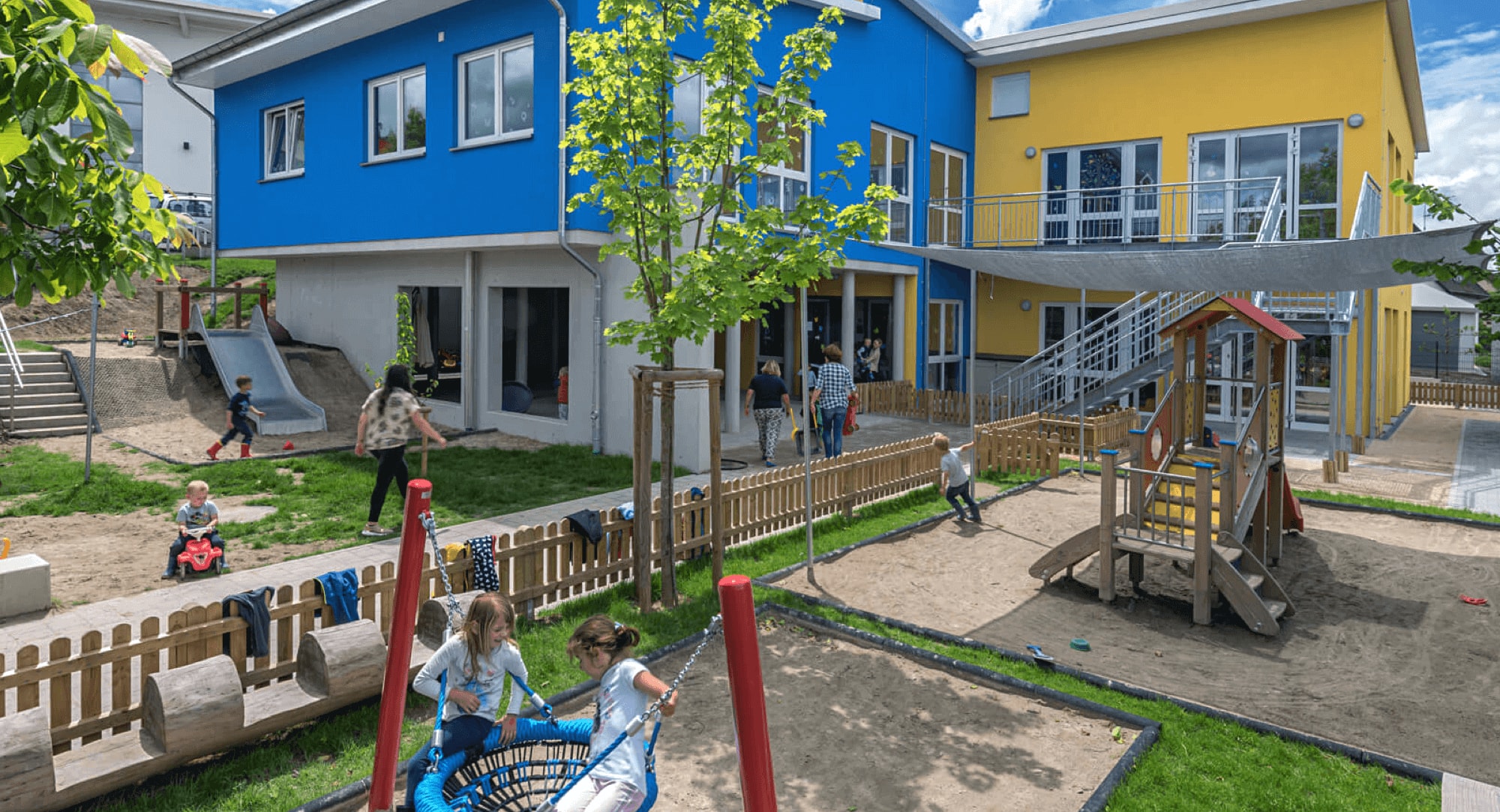 Der Einsatz unbedenklicher Baustoffe, sowohl für die menschliche Gesundheit als auch die Umwelt, hatte für den Bauherrn hohe Priorität. KLEUSBERG realisierte in Zusammenarbeit mit dem zuständigen Planungsbüro einen kindgerechten Neubau, der allen Anforderungen gerecht wird. Nach nur 14 Wochen Bauzeit konnte die Einrichtung schlüsselfertig übergeben werden. Das Untergeschoss wurde zum Teil massiv errichtet. Der sich daraus ergebene Unterstand bietet großzügigen Platz für sämtliche Spielgeräte, Bobbycars und Co. Alle übrigen Gebäudeteile wurden in Modulbauweise ausgeführt.