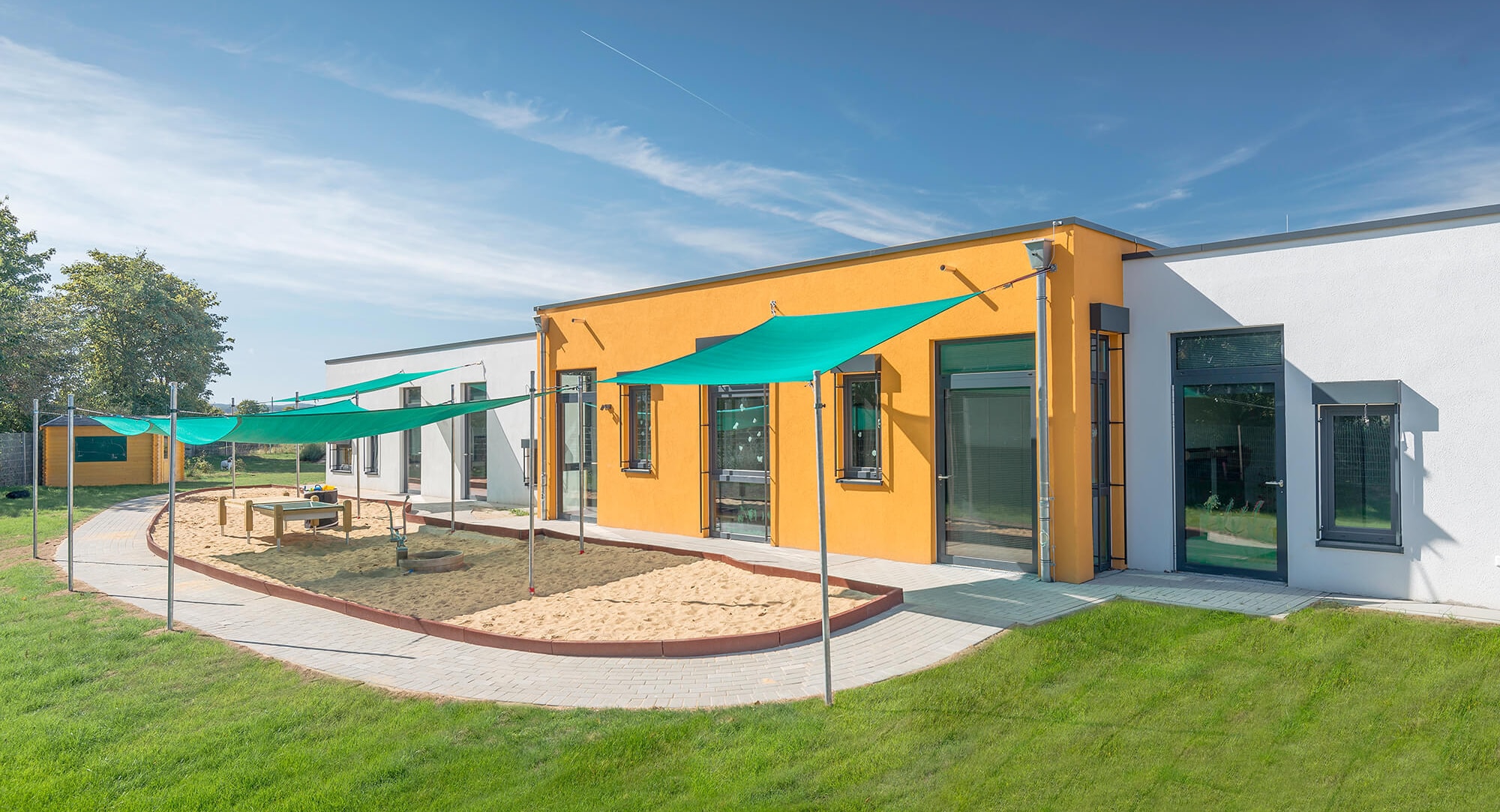 Lichtkuppeln unterstützen den Tageslichteinfall innerhalb des Gebäudes. Durch energieeffiziente LED-Beleuchtung entsteht eine angenehme Helligkeit in den Räumen. Unterschiedliche Fenstergrößen und -ausrichtungen ermöglichen den Kindern aufregende Sichtbeziehungen nach Draußen und geben dem 1-geschossigen Gebäudekörper ein abwechslungsreiches Erscheinungsbild. Der gruppenübergreifende Mehrzweckraum wird durch seine gelbe Farbgebung und den leichten Gebäudevorsprung optisch hervorgehoben. Mit Befestigungsmöglichkeiten für etwaige Spielgeräte, Turnmaterialien und vieles mehr lädt dieser zum Toben ein. In den Gruppenräumen kann die körperliche und motorische Entwicklung der Kinder ebenfalls gefördert werden. Deckenschienen und Abhängungspunkte erlauben die Nutzung von Anbauteilen wie Schaukeln oder Kletterseilen. Da das Erforschen der Umgebung auch mal ermüdend sein kann, schließen Schlafräume an die U3- und U2-Gruppenräume an, in denen die Kleinsten zur Ruhe kommen. Sichtbeziehungen zwischen den Räumen – in dieser Einrichtung in Form von Holz-Glas-Türen und feststehenden Glaselementen – regen die Neugierde an und motivieren durch Interaktion zum Mitmachen. Die Sanitärbereiche wurden mit extra kleinen WC´s und Wickeltischen ausgestattet. In dem Planschbecken können gleich mehrere Kinder mit dem Wasser experimentieren. Als gelungenes Referenzbeispiel und damit Vorzeigeprojekt diente die Kindertagesstätte in Swisttal, welche KLEUSBERG ebenfalls in modularer Bauweise errichtete.