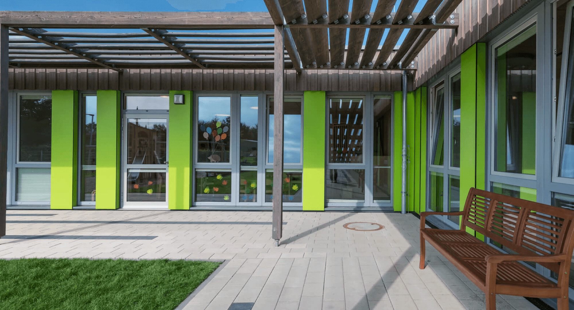 Die kontrastreiche Kombination aus sibirischem Lärchenholz und grünen Trespa-Elementen harmoniert mit der Gestaltung des Außengeländes und rundet das Erscheinungsbild gekonnt ab. Eine Holzpergola, optisch abgestimmt auf die Fassade, dient als Schattenspender für die Gruppenräume. Die zum Innenhof gerichtete Gebäudeseite ist mit großflächigen bodentiefen Fenstern ausgestattet, welche für optimale Lichtverhältnisse in den Räumen sorgen. Glasausschnitte in den Türen ermöglichen Sichtbeziehungen zwischen den Gruppen- und Sanitärbereichen und gewährleisten so eine durchgehende Beaufsichtigung. In den Nebenräumen wurden Schaukelaufhängungen integriert, sodass auch bei schlechtem Wetter die Motorik der Kinder durch Bewegungsspiele geschult wird. Passend zum Gesamtkonzept ist auch das neue Gerätehaus mit Holz verkleidet.