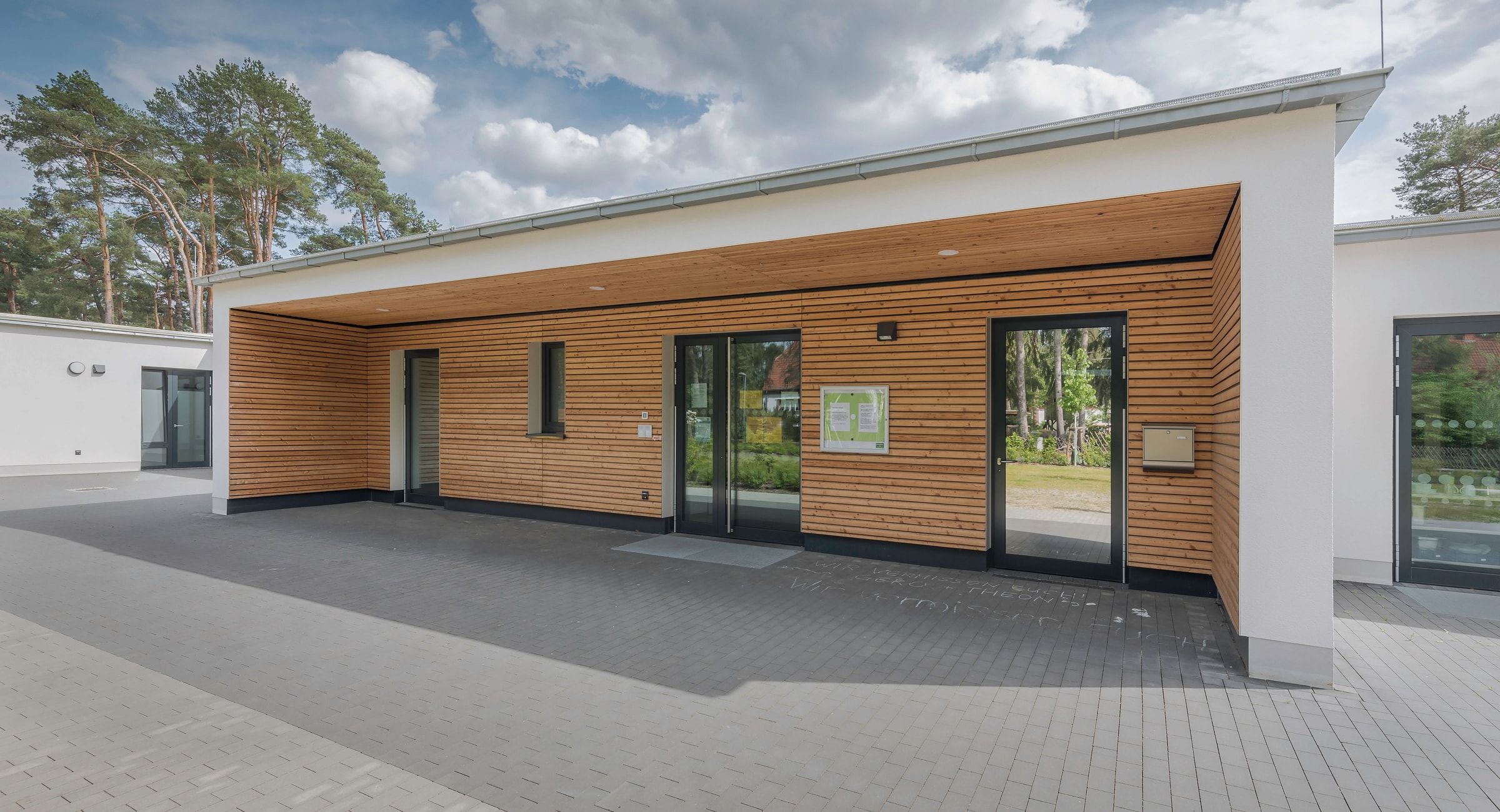 Da weder der Umbau, noch die Erweiterung der bestehenden Kita "Zwergenland" wirtschaftlich darstellbar war, entschloss sich die Gemeinde Heidesee für einen Neubau in Modulbauweise von KLEUSBERG. Der Baukörper wurde so auf dem Grundstück platziert, dass ausreichend Fläche für den Außenspielbereich gegeben ist. Das Modulgebäude bietet Platz für bis zu 100 Kinder, darunter 25 unter 3 Jahren. Diese werden in 4 Gruppen betreut. Das Konzept der integrativen Pädagogik und Inklusion sah von Transparenz geprägte Räume vor. Im Zuge einer teiloffenen Gruppenarbeit sollte auch der freie Wechsel innerhalb der Räumlichkeiten zu bestimmten Zeiten möglich sein. Der Zugang ins Gebäude wird über mehrere Eingänge gewährt. Von dort aus gelangt man in zwei unterschiedliche Foyers. Eines davon bildet mit der angrenzenden Cafeteria eine innere Piazza. Große runde Lichtkuppeln öffnen den Flur nach oben hin und durchfluten ihn mit Tageslicht, sodass eine angenehme Helligkeit entsteht. Ebenfalls runde Deckenleuchten unterstützen die Formgebung. Die barrierefreie Cafeteria mit Kinderküche dient als zentraler Essbereich für Kids ab 4 Jahren, gleichzeitig kann sie für übergreifende Aktionen und Veranstaltungen genutzt werden. Hinter der Kinderküche ist die eigentliche Aufwärmküche angesiedelt.