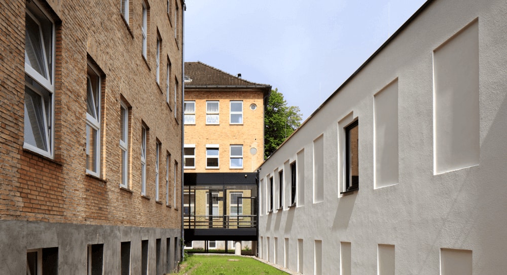 Aber nicht nur diese beachtliche Kabellänge und eine besonders effiziente Lüftungsanlage waren Bestandteile des speziellen Anforderungsprofils für den heutigen Erweiterungsbau der Klinik für Innere Medizin III. Auch eine bestmögliche Integration in den Gebäudebestand spielte eine wichtige Rolle. Aus diesem Grund entschied man sich für eine Einbindung vom Innenhof der 1. Medizinischen Klinik im Bereich des nördlichen Westflügels aus. Ein -barrierefreier Verbindungsgang, auf Stahlbetonstützen ruhend, -verbindet dabei Neu und Alt. Aus 10 vorgefertigten Raummodulen errichtet und mit einer Wärmedämmverbundfassade versehen, beherbergt der Neubau in Modulbauweise heute neben dem eigentlichen Herzkatheterlabor auch Platz für die Patientenüberwachung und einen Bettenwarte-bereich sowie ein Stellgutlager. Die Schwerlastdecke mit Schienen für eine deckengebundene Befestigung der Röntgenanlage erlaubt zudem mehr Behandlungsergonomie für das Klinikpersonal. Technische Besonderheiten wie u. a. ein 56 Zoll HD Monitor, der eine deutlich bessere Darstellungsqualität in 3-D-Optik ermöglicht, macht die Anlage zum deutschlandweit ersten volldigitalen Katheter-Interventionssystem dieser Bauart.
