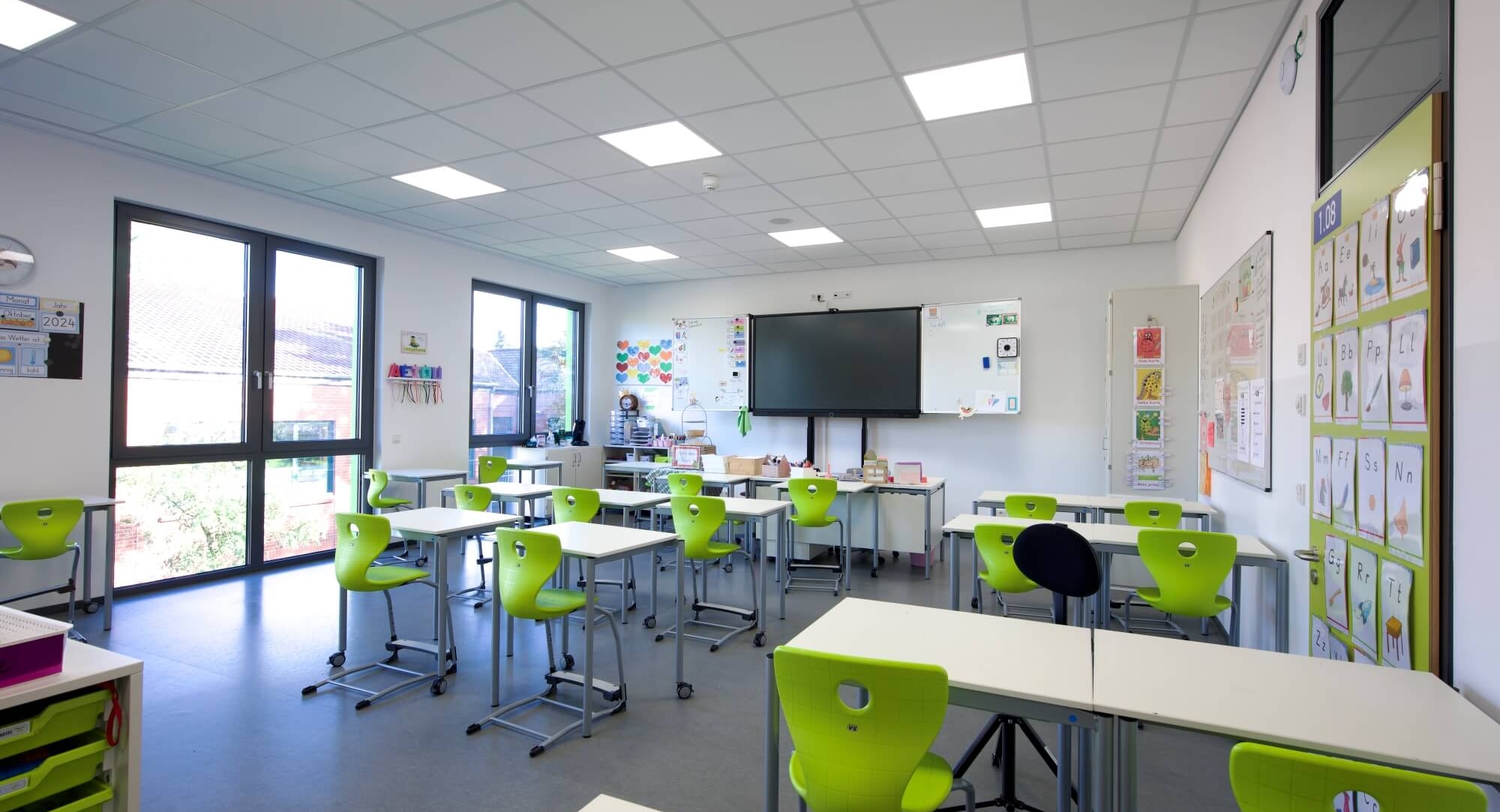 Ein umfassendes barrierefrei-Konzept, inklusive eines Aufzugs, gewährleistet die Zugänglichkeit aller Bereiche. Die Raumgestaltung umfasst nicht nur 6 Klassenzimmer, sondern auch zugehörige Differenzierungsräume, die durch mobile Trennwände flexibel miteinander verbunden werden können. Zusätzlich wurden ein Mehrzweckraum und ein komfortables Lehrerzimmer geschaffen.