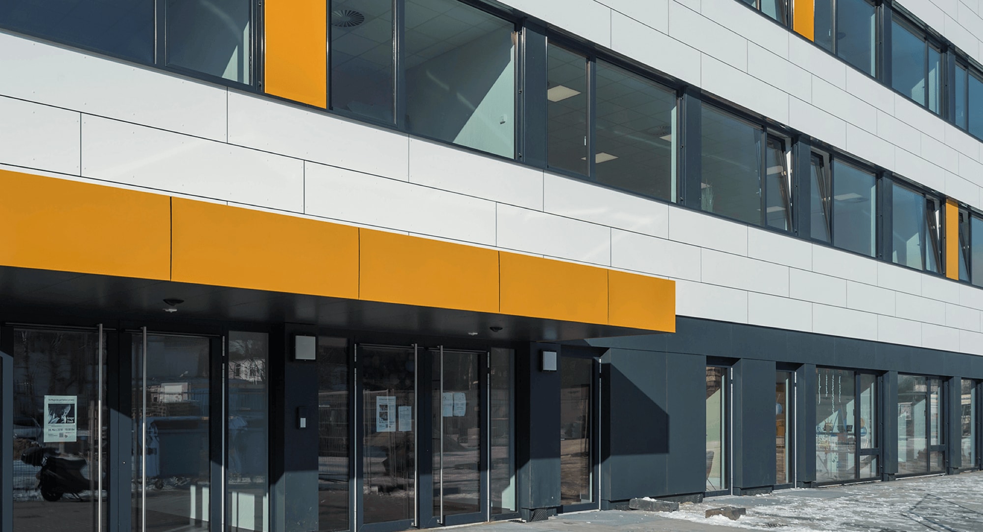 Statt einem gewöhnlichen Pausenhof außerhalb des eigentlichen Gebäudes wird dieser in Form einer Dachterrasse geboten. Neben dem eigentlichen Nutzungszweck kann dieser für sowohl schulinterne Events genutzt, als auch von kulturellen, poltischen oder privaten Einrichtungen gebucht werden. Die Fassadenkombination aus Lochblech als strukturelles Designelement und HPL-Platten gibt dem Gebäude ein ansprechendes Erscheinungbild. Farbige Blindelemente an den Fenstern werden optisch hervorgehoben. Das Gelb findet sich sowohl am Vordach des Eingangsbereiches als auch in den Räumlichkeiten selbst wieder.